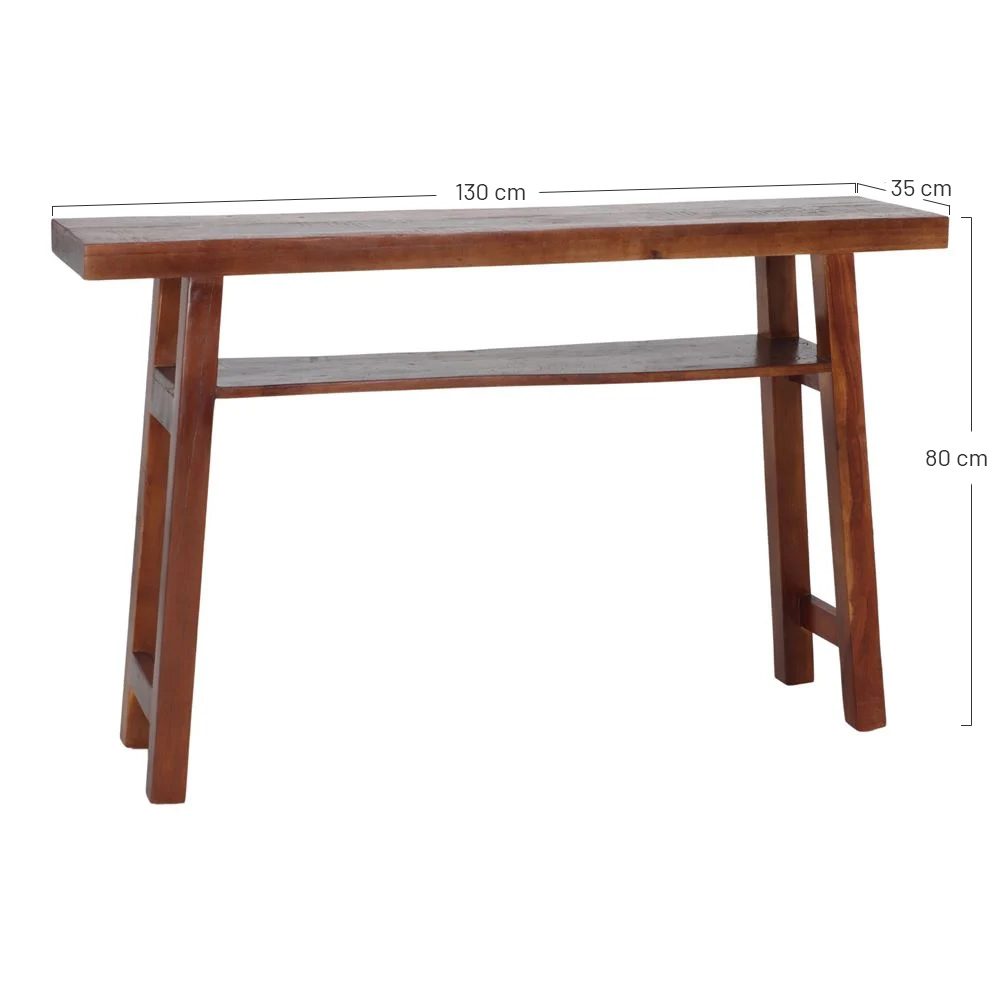 Consolle rettangolare in legno massiccio di pino riciclato con ripiano inferiore..