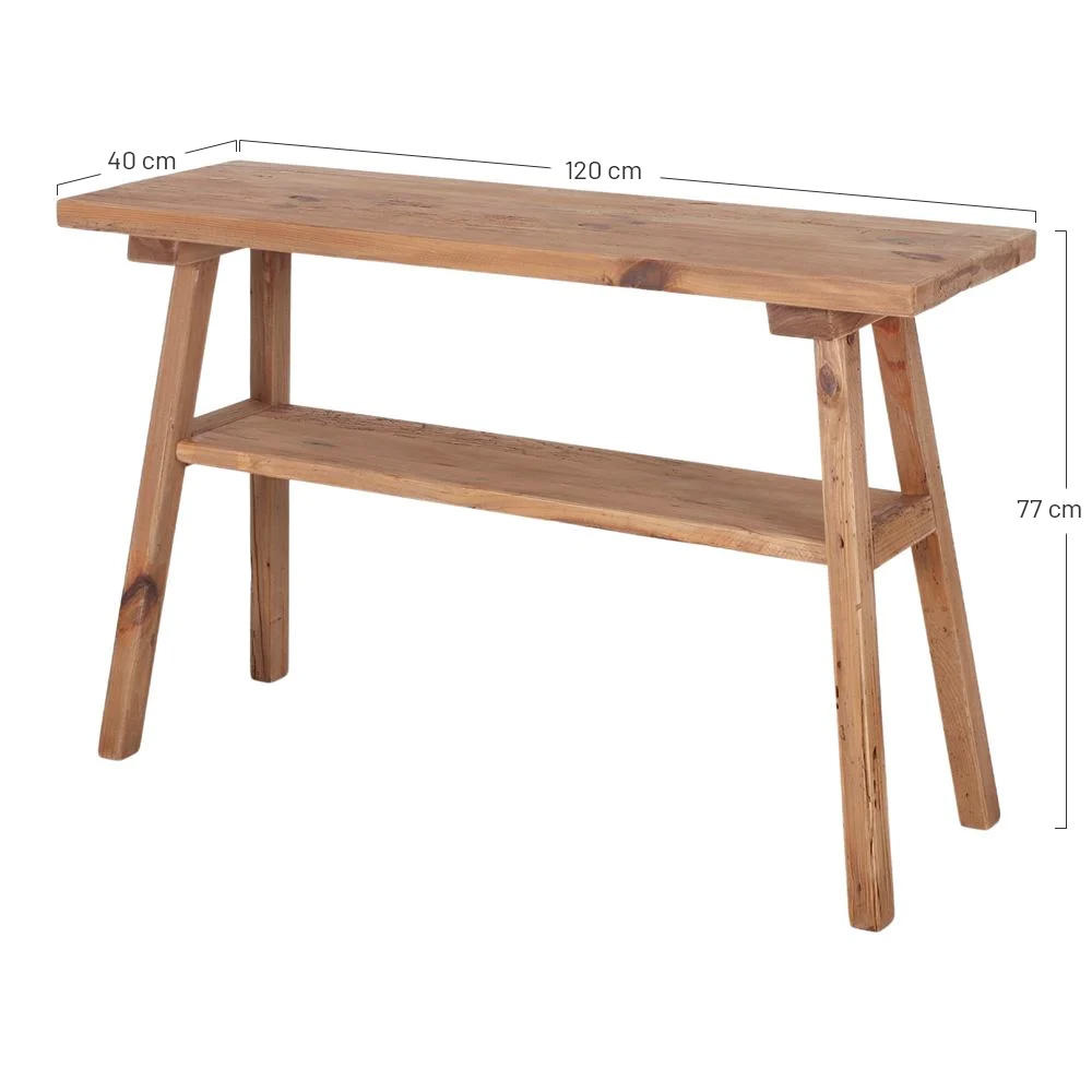 Consolle rettangolare in legno di pino massiccio riciclato con ripiano inferiore.