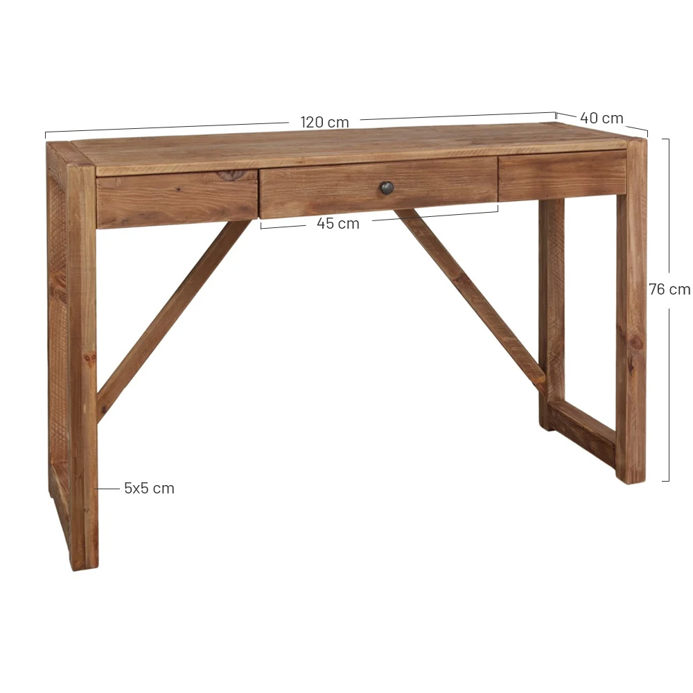 Consolle – scrivania in legno massiccio di pino riciclato con cassetto frontale.