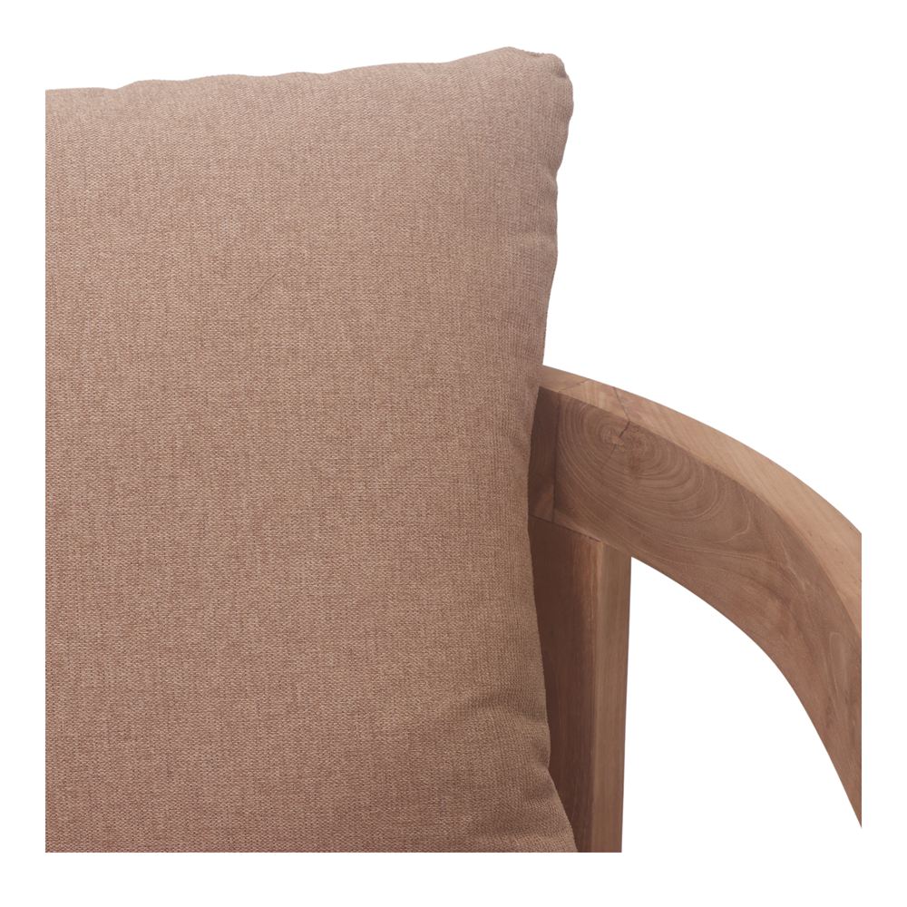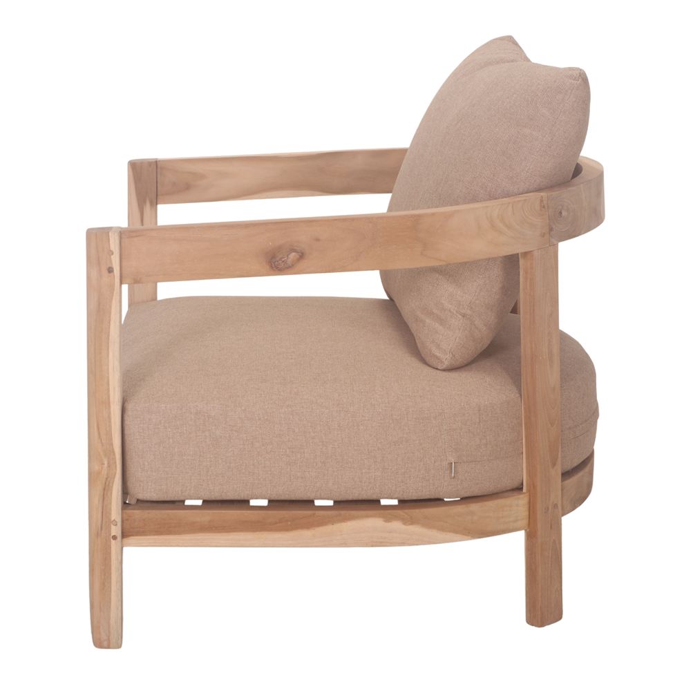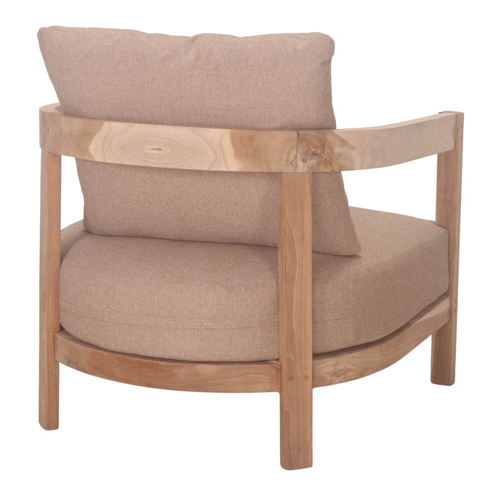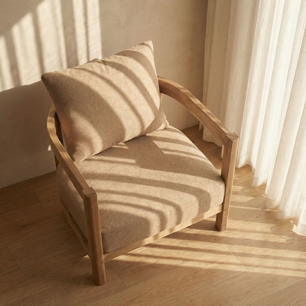 La poltrona è dotata di cuscini rivestiti in tessuto color tan, una tonalità neutra che si armonizza con il tono del legno e aggiunge comfort alla seduta. Il rivestimento è stato progettato per essere morbido al tatto e resistente all’uso quotidiano, rendendo questa poltrona un’opzione pratica e accogliente.
