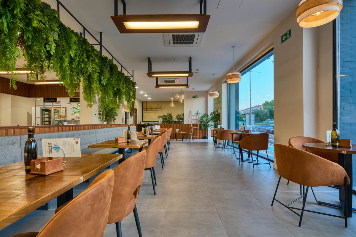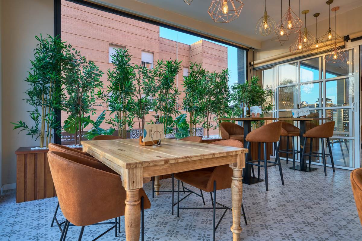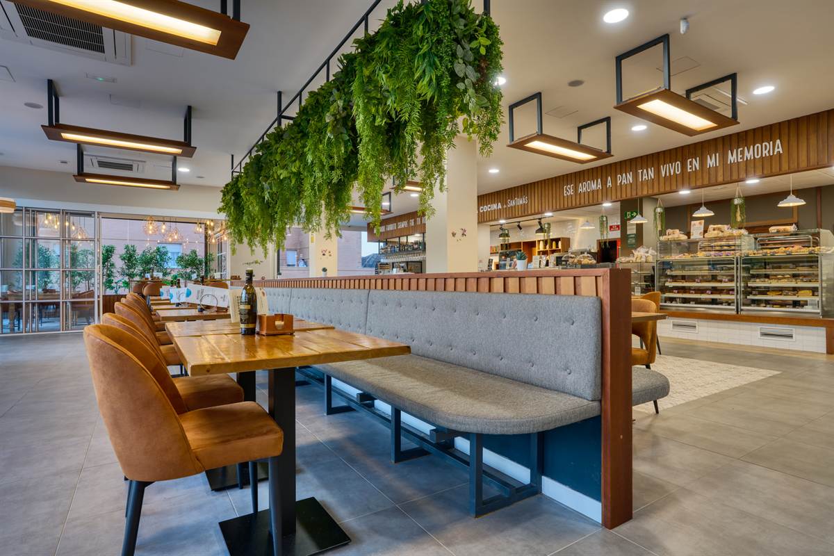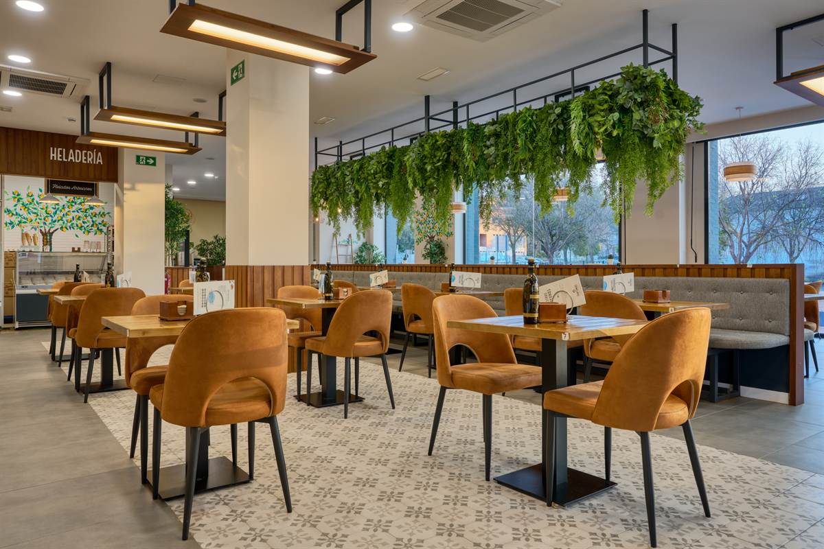 Uno degli elementi visivi più suggestivi è l’uso della vegetazione. Una grande struttura sospesa sopra la panchina continua trabocca piante rampicanti, creando una barriera visiva naturale che spezza la linearità del soffitto e rinfresca l’ambiente. Questo «giardino pensile» dialoga con le ampie vetrate, che lasciano che la luce del tramonto di Bormujos inondi ogni angolo, sfumando il confine tra interno ed esterno.