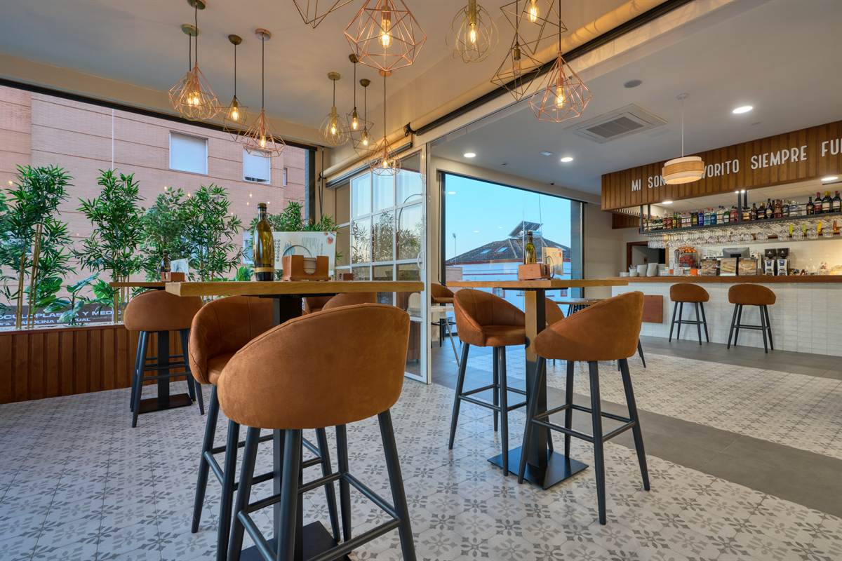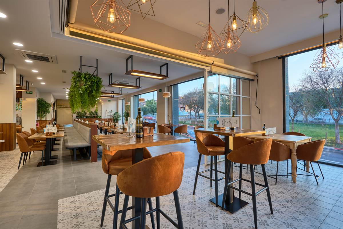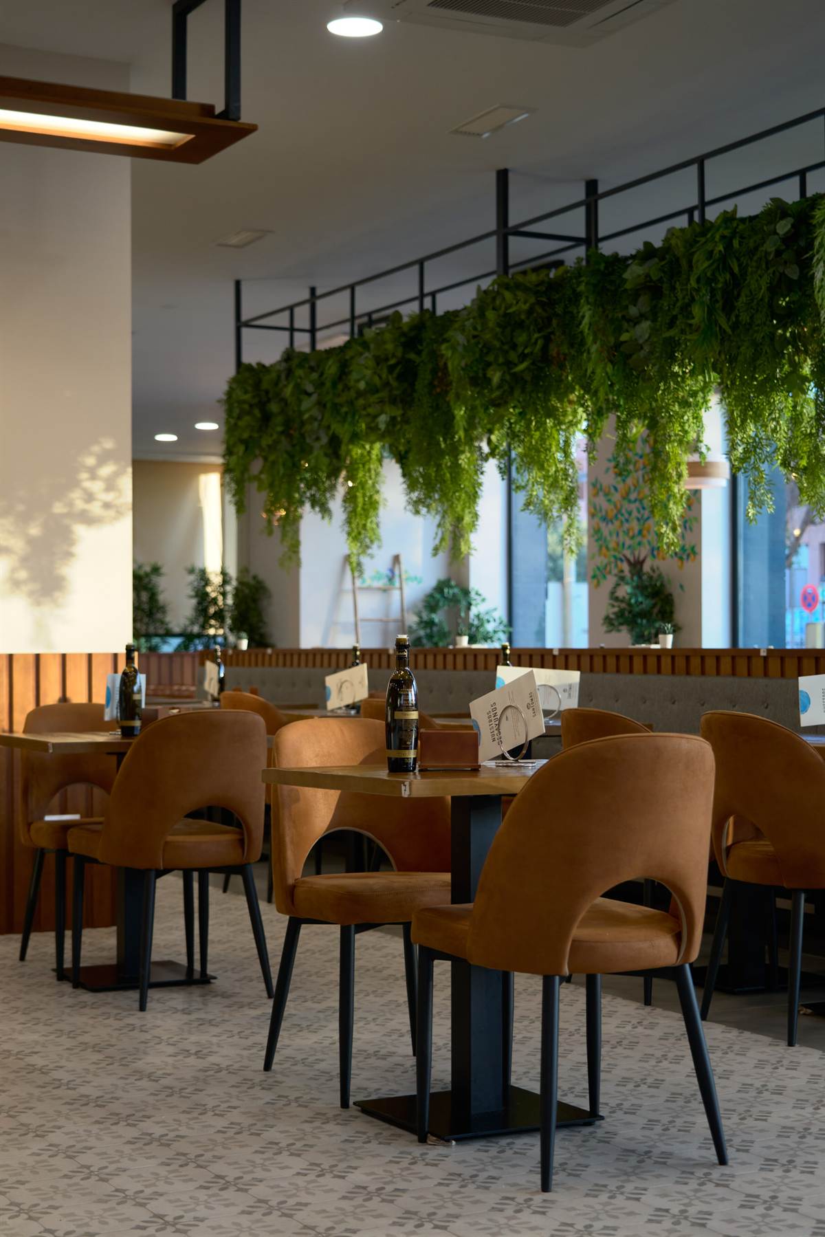 Uno degli elementi visivi più suggestivi è l’uso della vegetazione. Una grande struttura sospesa sopra la panchina continua trabocca piante rampicanti, creando una barriera visiva naturale che spezza la linearità del soffitto e rinfresca l’ambiente. Questo «giardino pensile» dialoga con le ampie vetrate, che lasciano che la luce del tramonto di Bormujos inondi ogni angolo, sfumando il confine tra interno ed esterno.