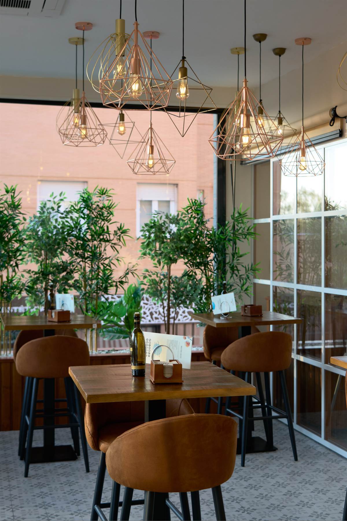 Il progetto si distingue per una selezione di materiali che trasmettono un senso di autenticità. Il legno naturale è il vero protagonista, presente nei robusti tavoli di fattura artigianale e in un elegante rivestimento a doghe verticali che conferisce ritmo e calore alle pareti. Questo elemento organico si bilancia con la sobrietà dei pavimenti: una combinazione di gres porcellanato nei toni del cemento con tappeti di piastrelle idrauliche che delimitano le zone del bancone e dei tavoli alti, conferendo un tocco nostalgico e artigianale.