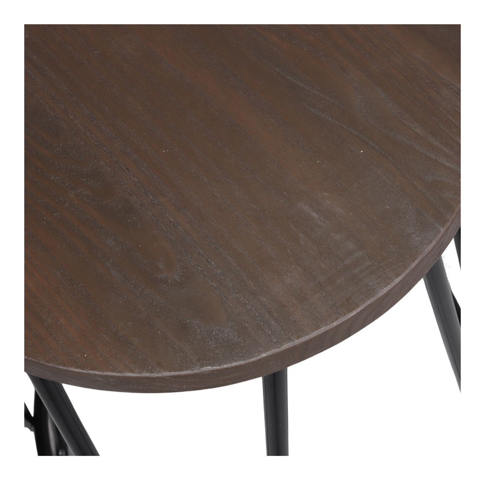 Nella parte superiore, la seduta in legno massello apporta il necessario tocco di calore. La finitura scura del legno, che ne esalta le venature naturali, si armonizza perfettamente con la sobrietà del metallo, dando vita a un elemento che si adatta sia ad ambienti di ispirazione industriale che a cucine dallo stile minimalista. L’anello metallico inferiore funge da poggiapiedi ergonomico che circonda l’intera struttura, consentendo una postura comoda e rilassata durante l’uso.