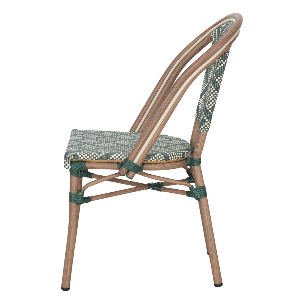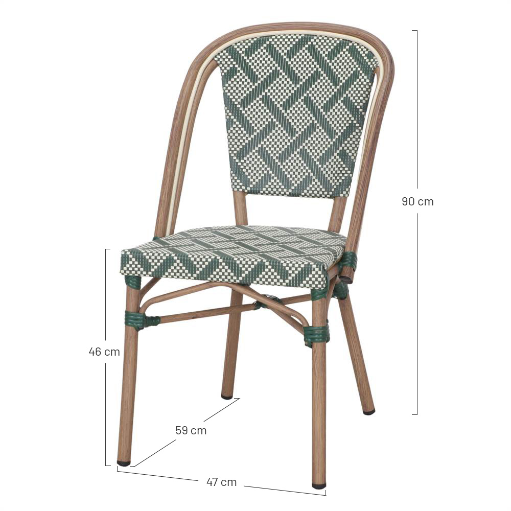 La struttura è realizzata in alluminio tubolare, un materiale resistente e leggero, ideale per gli ambienti esterni. La finitura in finto bambù non solo aggiunge calore estetico, ma conferisce anche un tocco naturale ed esotico, evocando il fascino dei caffè tradizionali. Sia la seduta che lo schienale sono realizzati in midollo di rattan sintetico, un materiale che offre l’aspetto del rattan naturale ma con una maggiore resistenza agli agenti atmosferici e all’usura.