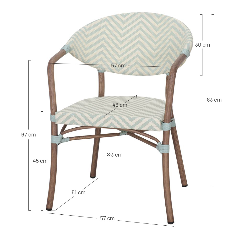 La sua struttura tubolare in alluminio, leggera ma robusta, è rifinita in una delicata tonalità di finto legno d’ulivo, che offre calore e un aspetto naturale senza rinunciare alla resistenza del metallo. La seduta e lo schienale sono realizzati in textilene, un materiale di alta qualità, confortevole, traspirante e di facile manutenzione che garantisce una lunga durata in caso di utilizzo continuo.