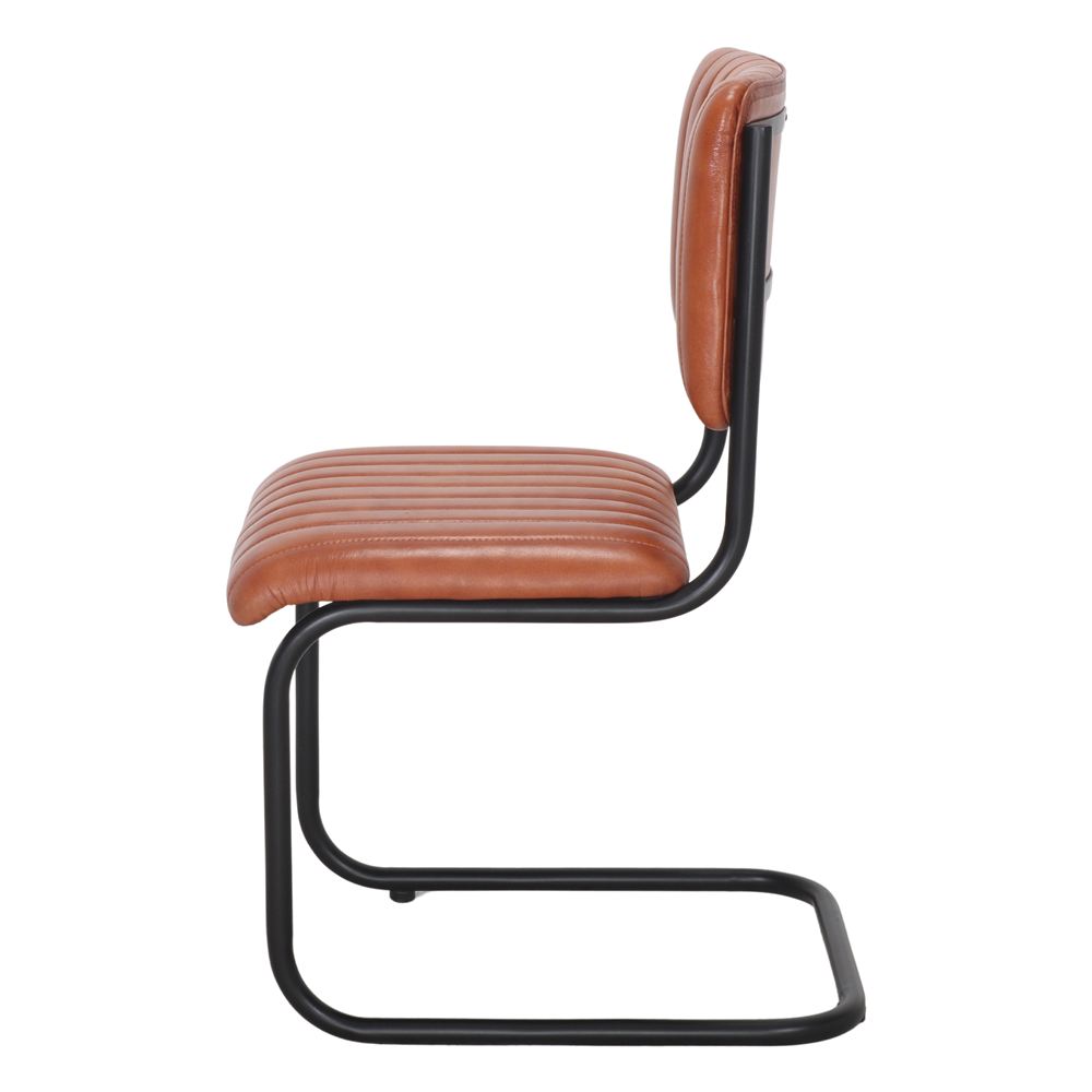 Sedia in pelle MOXIES, con un marcato stile Mid Century, ideale per gli interni che vogliono ottenere quello stile contemporaneo che non passa mai di moda. Struttura in acciaio verniciato in nero, seduta e schienale rivestiti in pelle di capra marrone. Un design semplice che fa la differenza. Si abbina perfettamente ai tavoli in legno naturale.